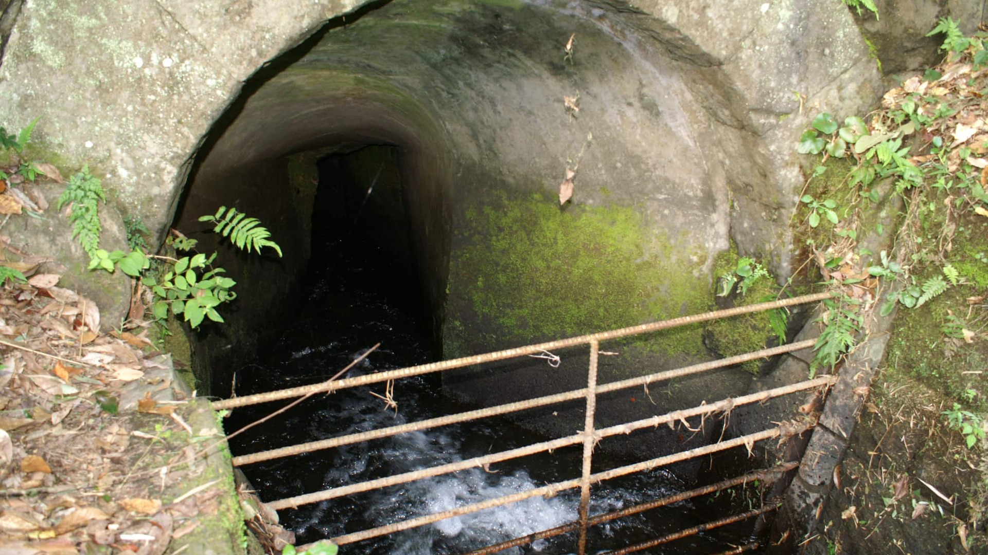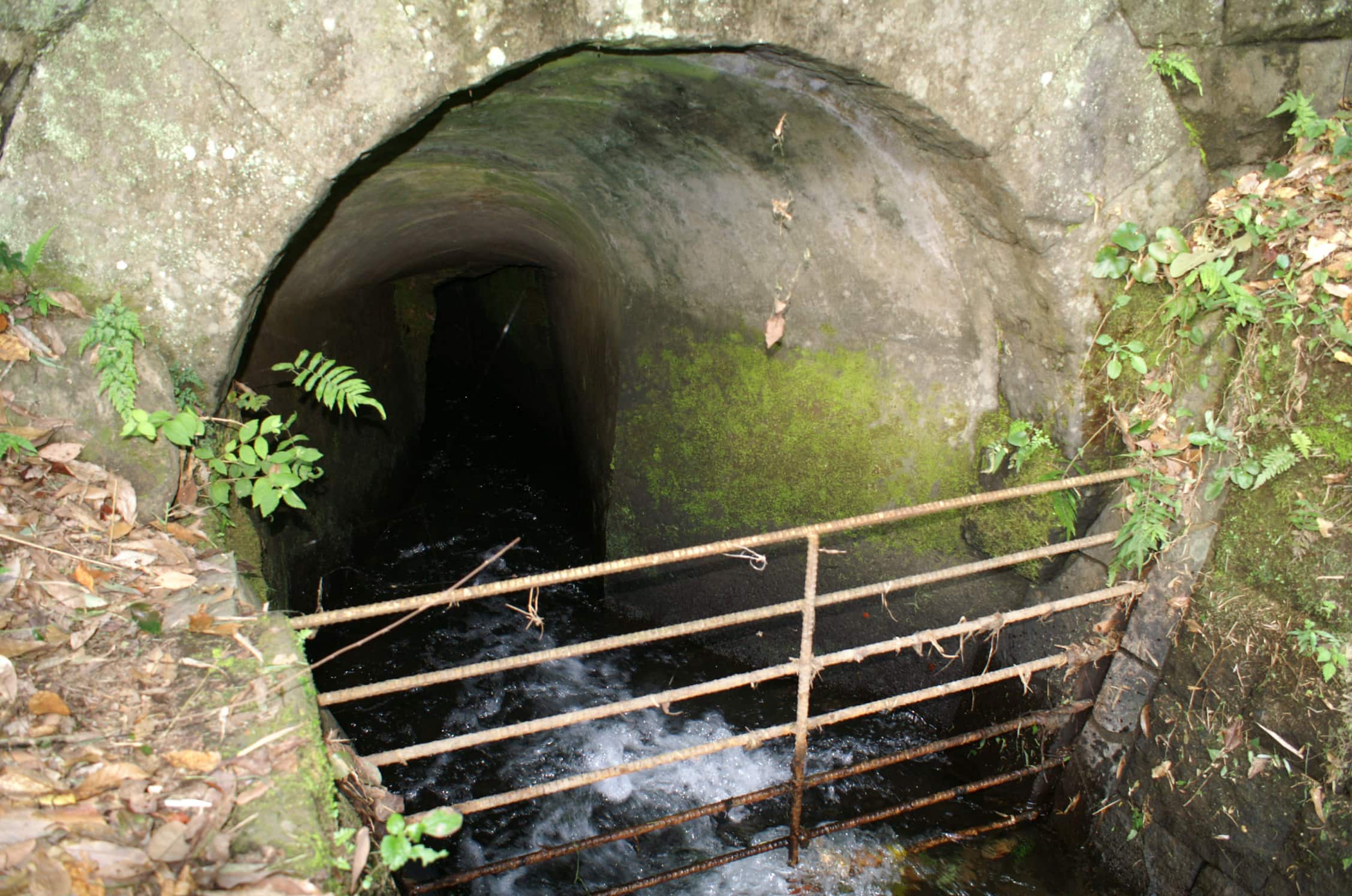 岩屋公園内にある隧道(ずいどう)は、江戸時代の寛文(かんぶん)三年(一六六三年)に開田、十五町歩の用水として延長一七三メートル(九十五間)を測量(そくりょう)器具(きぐ)のない時代にローソクの火を使って水平(すいへい)方向(ほうこう)を定め、工事を進めた。また、罪人(ざいにん)を使って、人力で掘ったという言い伝えがある。当時は大変な難工事(なんこうじ)であったろうと想像される。両側から掘ったらしく、中間(ちゅうかん)に滝が出来て、水の音がする。中にはコウモリがいて、土砂が堆積(たいせき)している。
