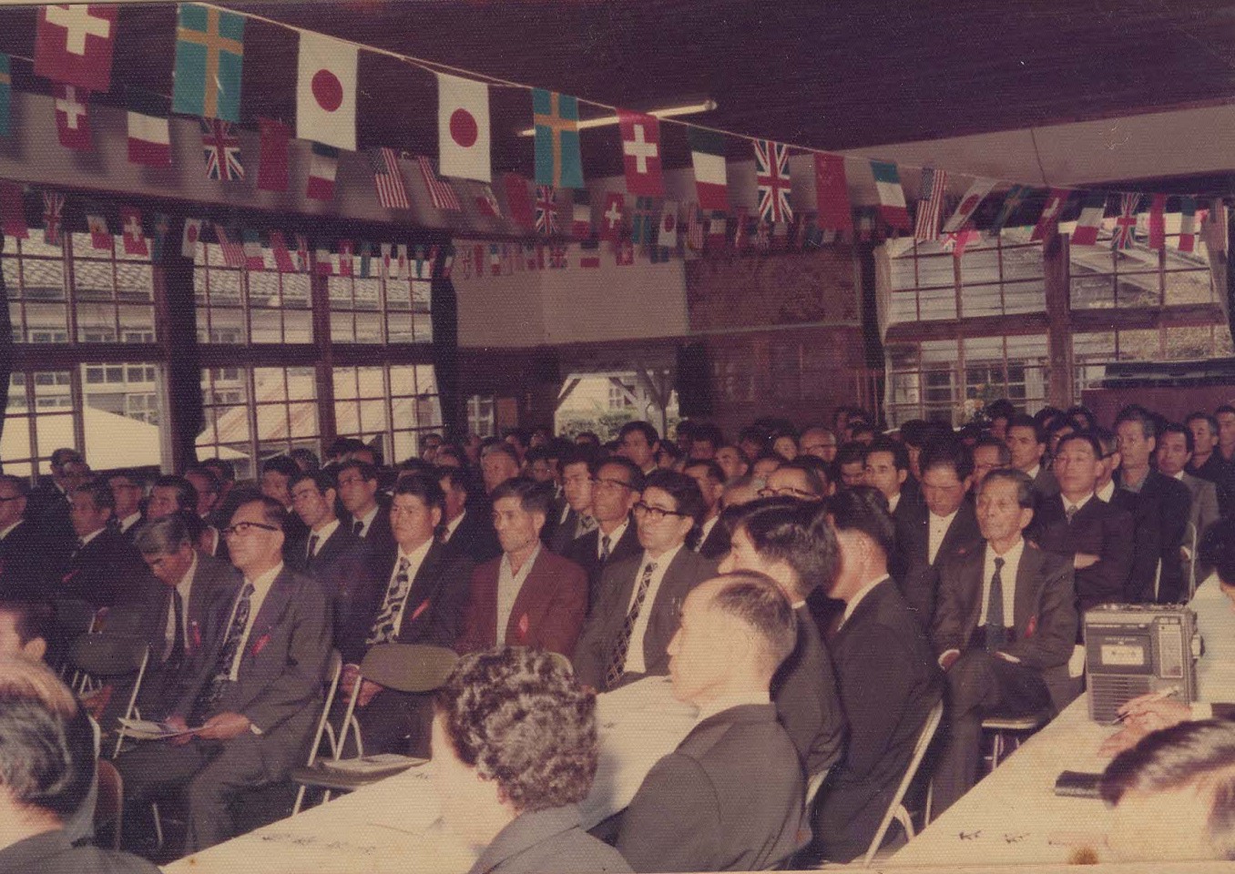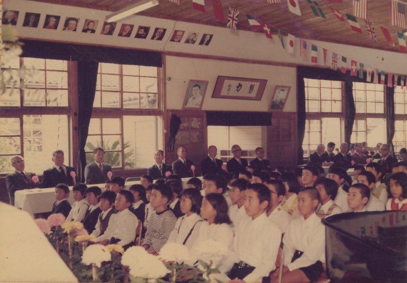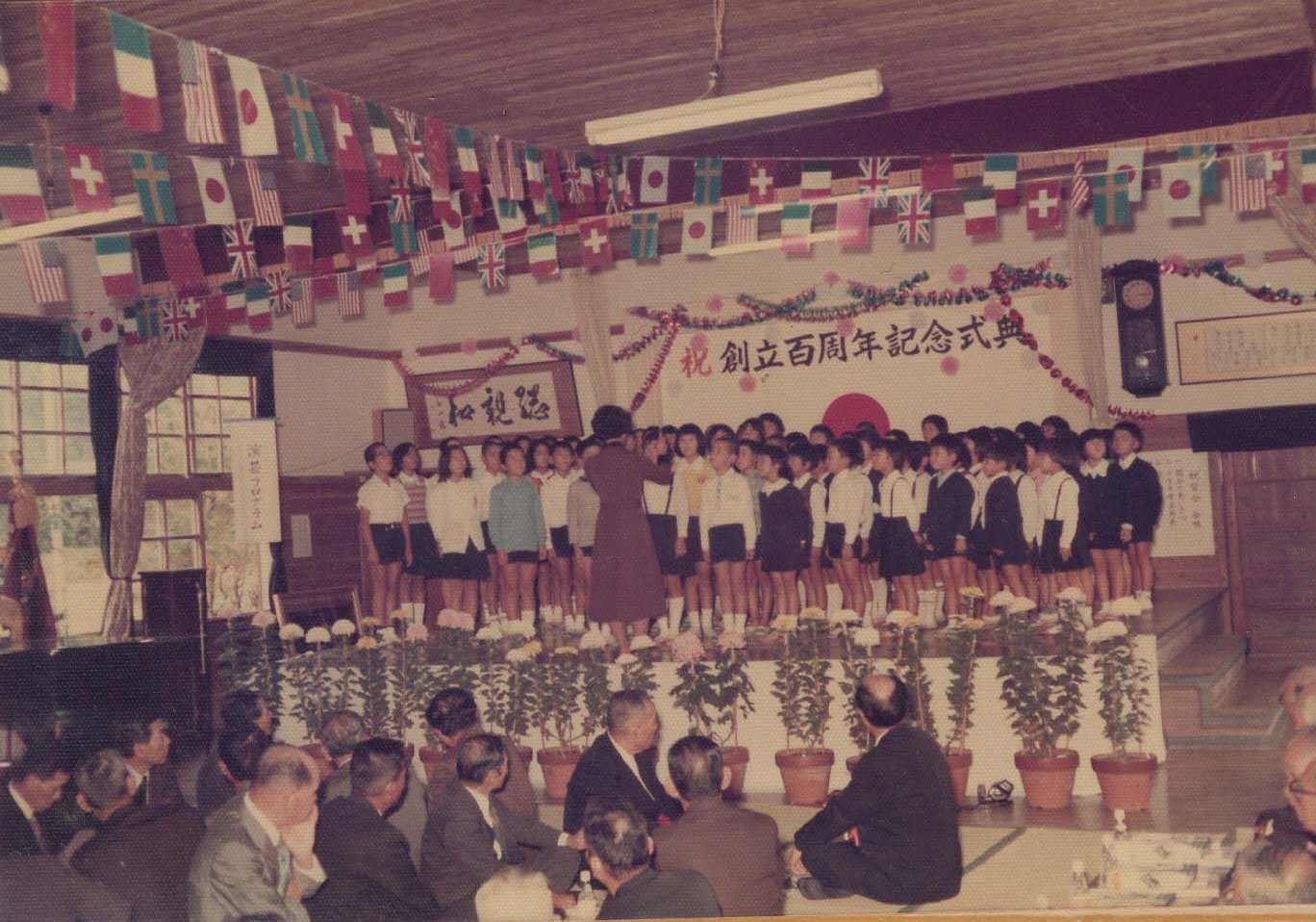 昭和53年創立100周年の式典の様子です。この時の児童は、現在50歳代です。旧清水小学校の講堂の内部の様子がわかります。
