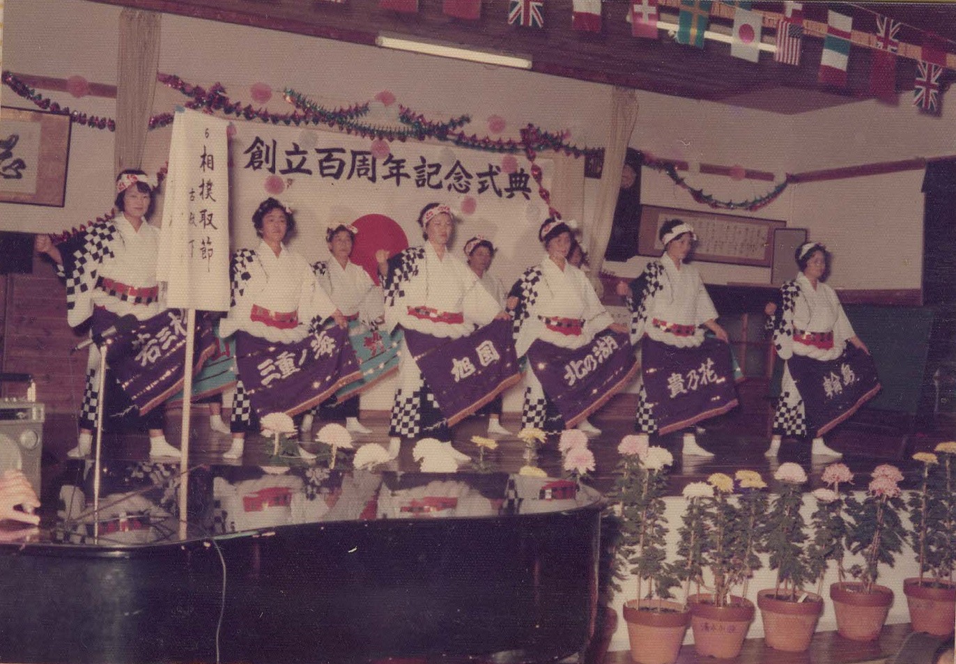 式典の後は、祝賀会だったのでしょうか。当時の小組合(現在は自治会)や組ごとにたくさんの演芸が繰り出し、その演芸は、女性が担っていたようです。