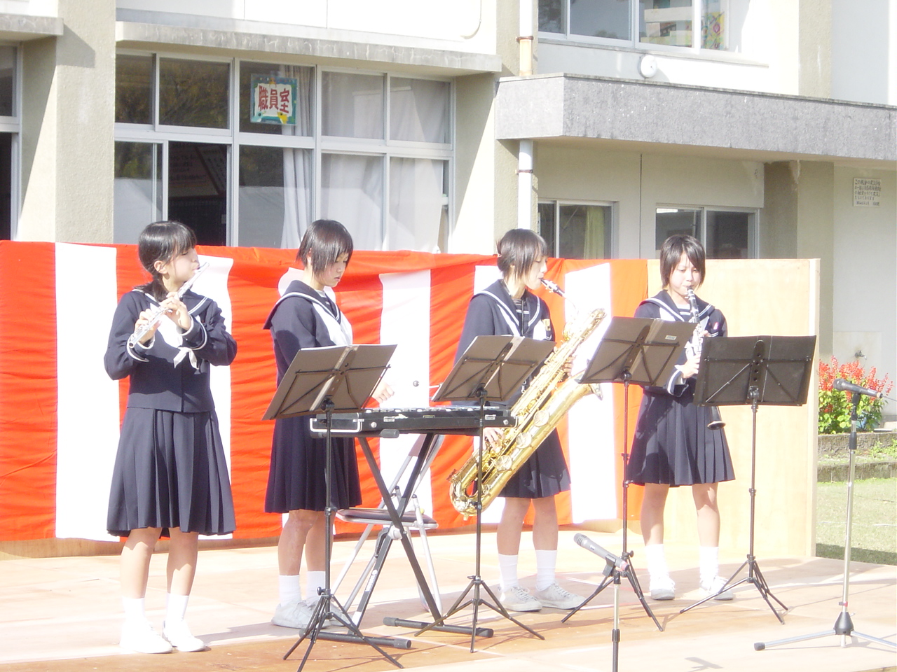 清水小学校で器楽合奏を学んだ子どもたちが、中学校に入学して器楽合奏の部活に入り、母校で披露している様子です。地域みんなが参加して、楽しい一日を過ごしていました。