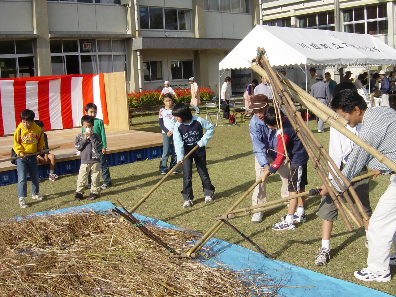 地域で採れたそばを巡り棒(めぐりぼう)を使って脱穀体験している様子です。経験のある人が子どもたちに教えていますが、経験が少なく苦戦している姿も・・・(この写真に写っている教える人は上手な人ですよ。)