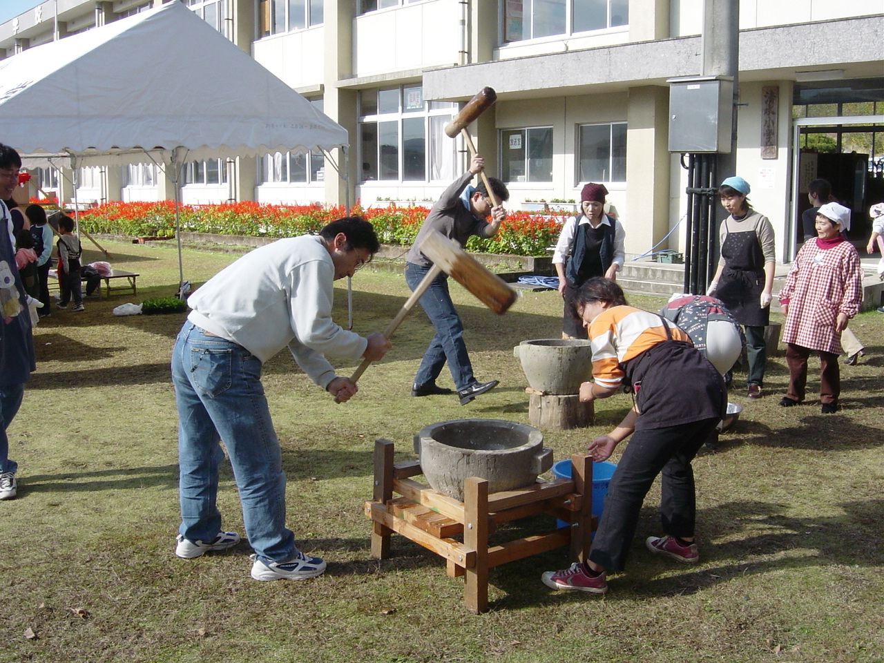 来場者に大好評のからいも餅を作っている様子です。杵と臼を使った餅つきから機械に替わった世代には経験がなく、いい練習の場にもなっていました。。