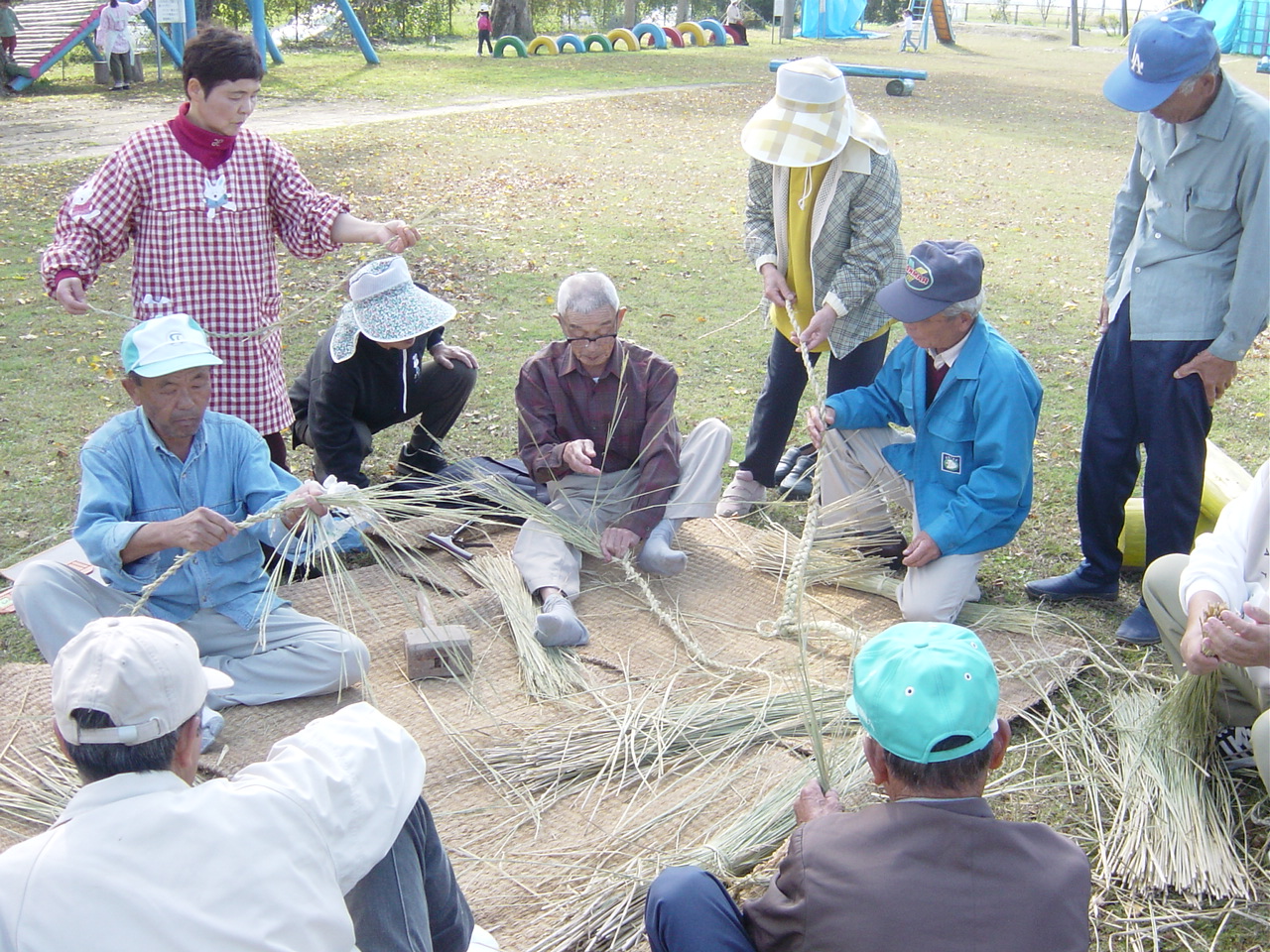 しめ縄づくり体験です。経験のありそうな人たちが思い出しながら作っているようですが、なかなか難しい作業なので、先生の手ほどきを受けています。