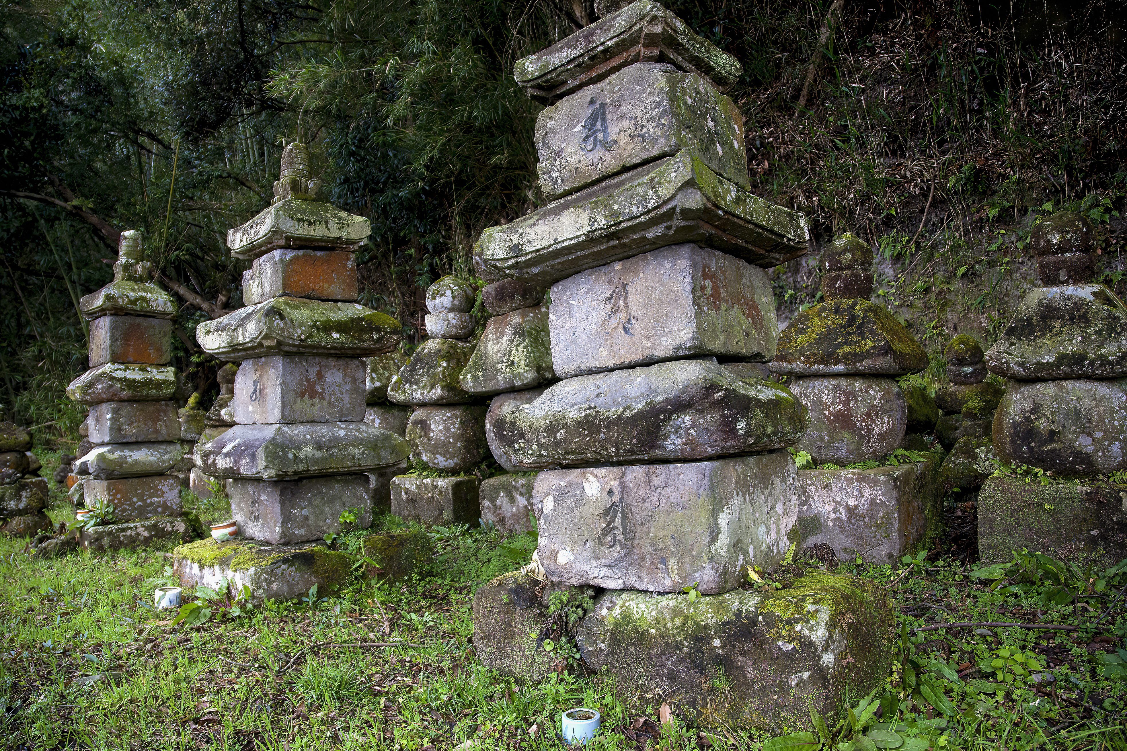 清水小学校から明神橋を渡り岩屋公園側に進んだところに3基の層塔とたくさんの五輪塔が安置されています。これらの石塔は、旧清水小学校の整備するときに出土したものです。