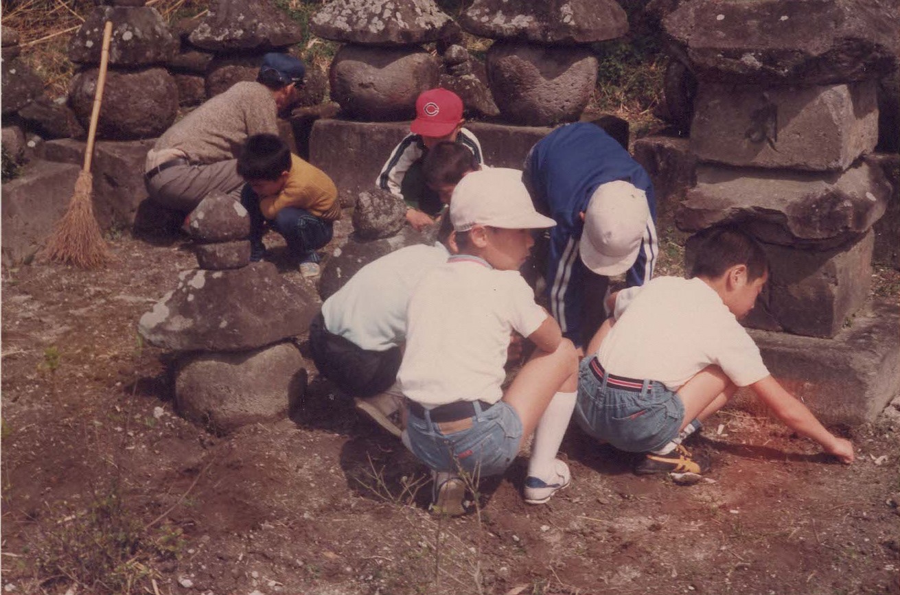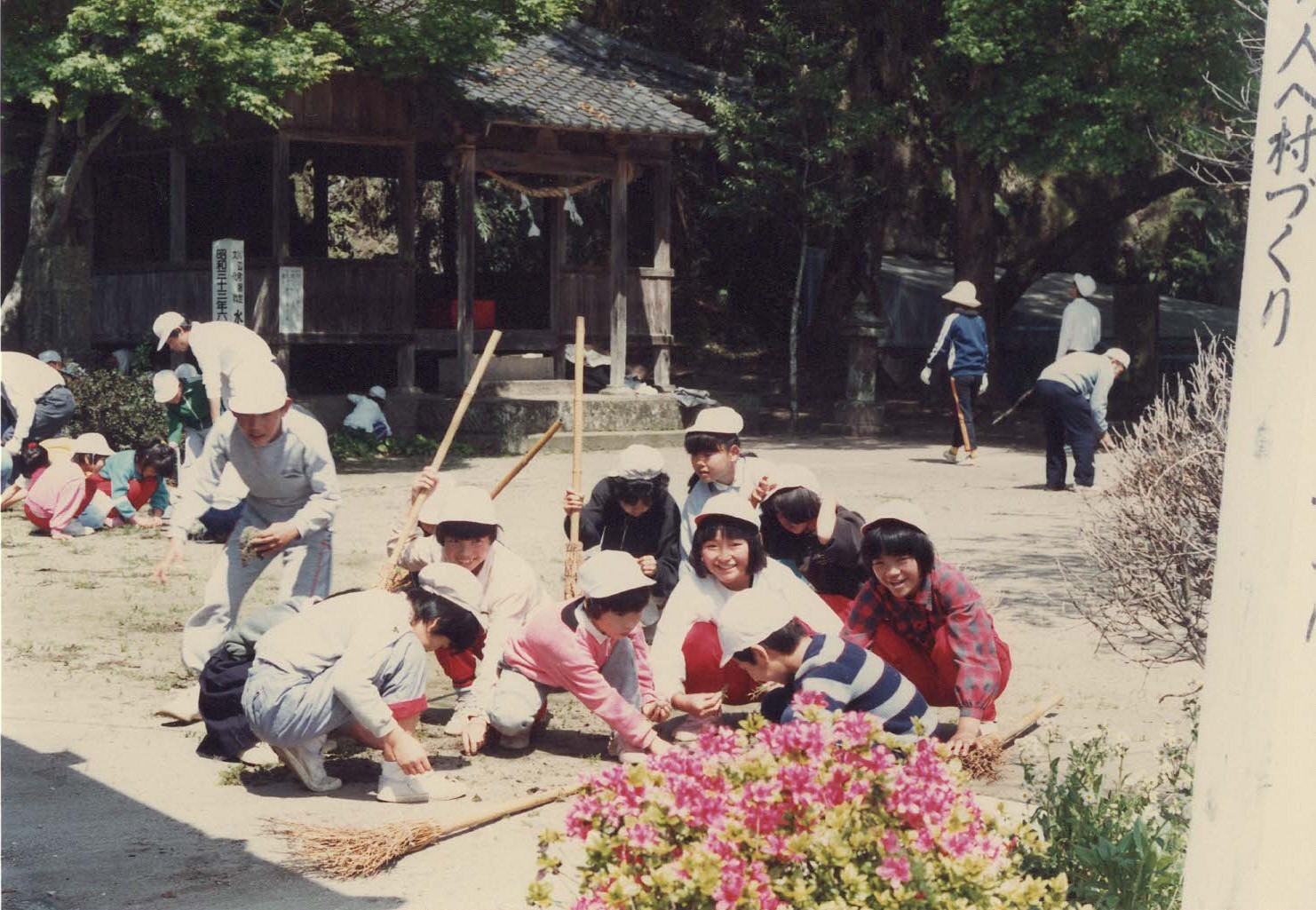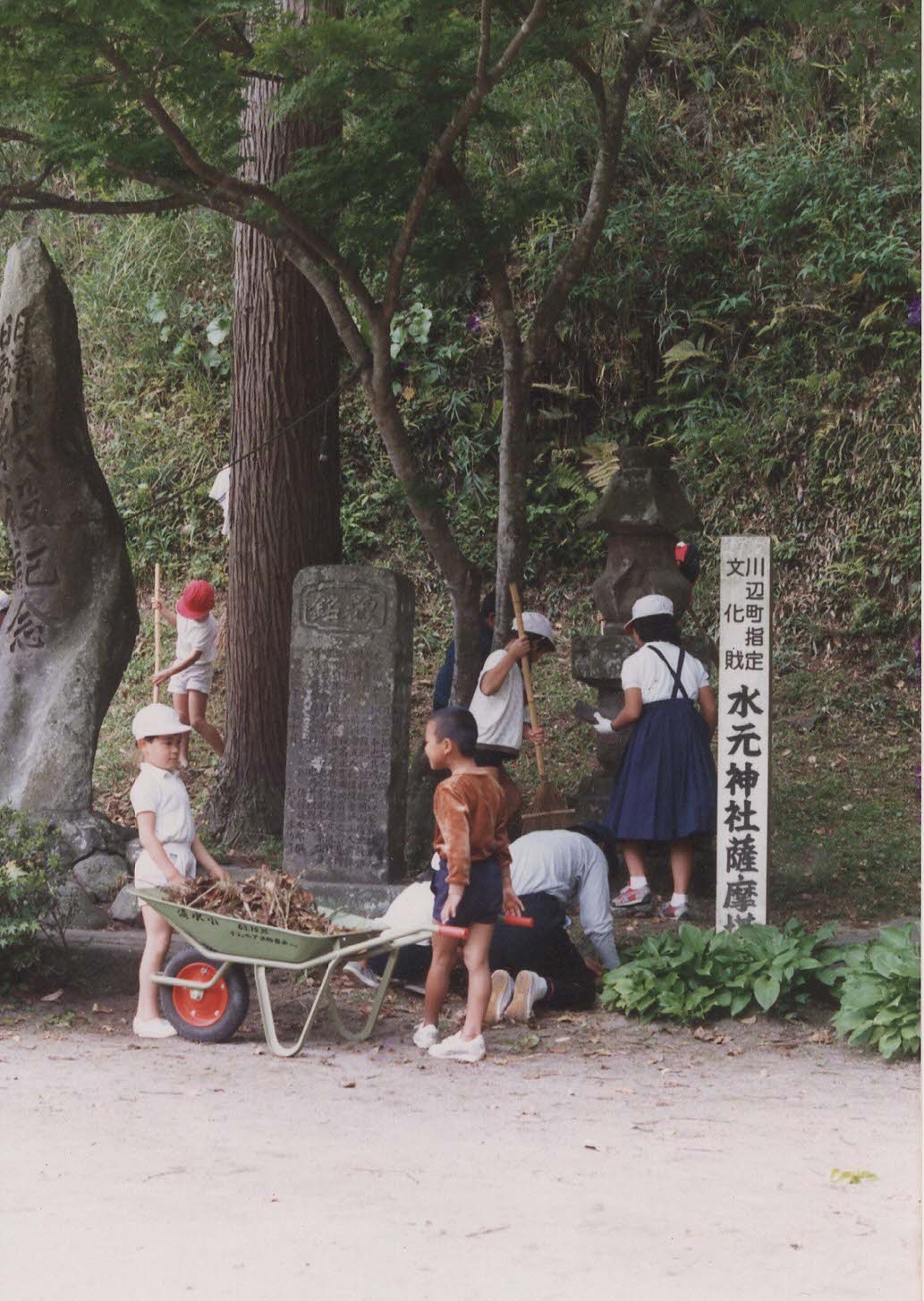 昭和62年、清水小学校の子どもたちが「名水クリーン作戦」の作業で、水元神社と同じ敷地にある薩摩塔と戦役記念碑周辺の掃除の様子です。水元神社の境内には、水神様や田の神様も安置されています