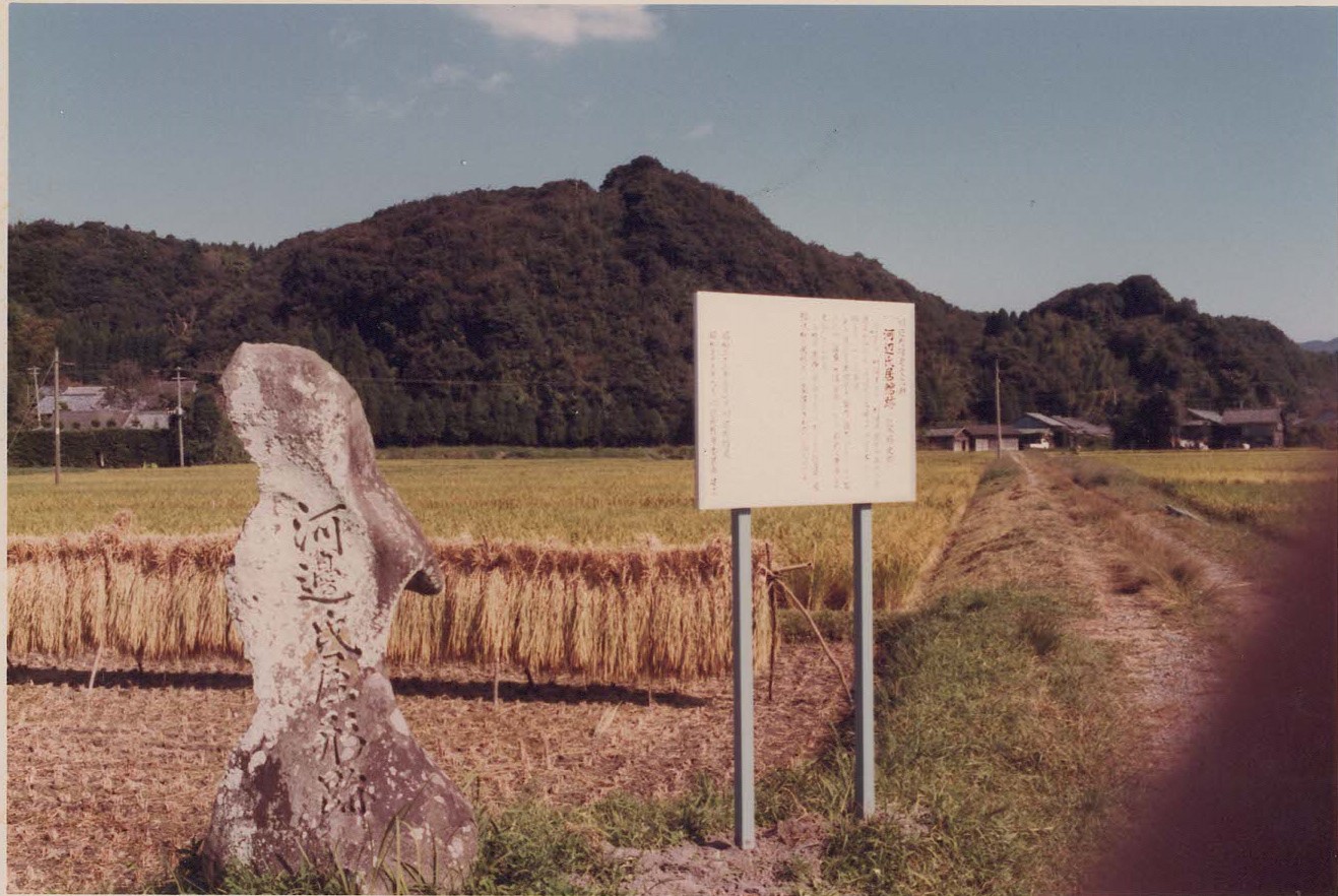 桜元から万之瀬川に向かった田んぼの中に建てられた記念碑です。平安時代の終わりごろ河辺氏が郡司となり、川辺盆地に号令を出すのに適した場所として、ここに本拠地を置いたと伝えられています。