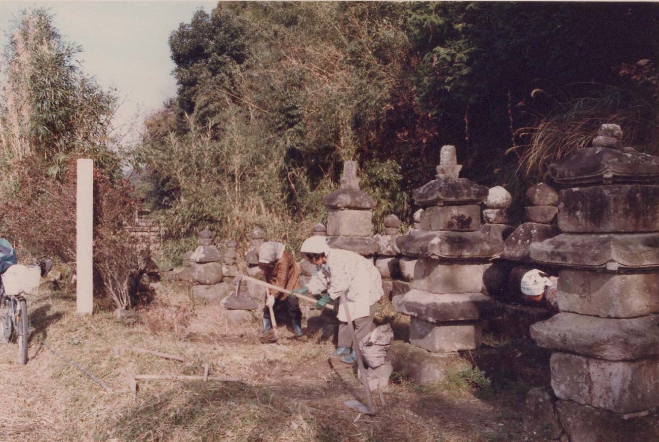 昭和56年、高齢者の皆さんが、層塔群の掃除をしている様子です。現在も毎年9月に高齢者や地域の役員の皆さんが草を払ったり、絡みついている蔦(つた)かずらをとったりしています。