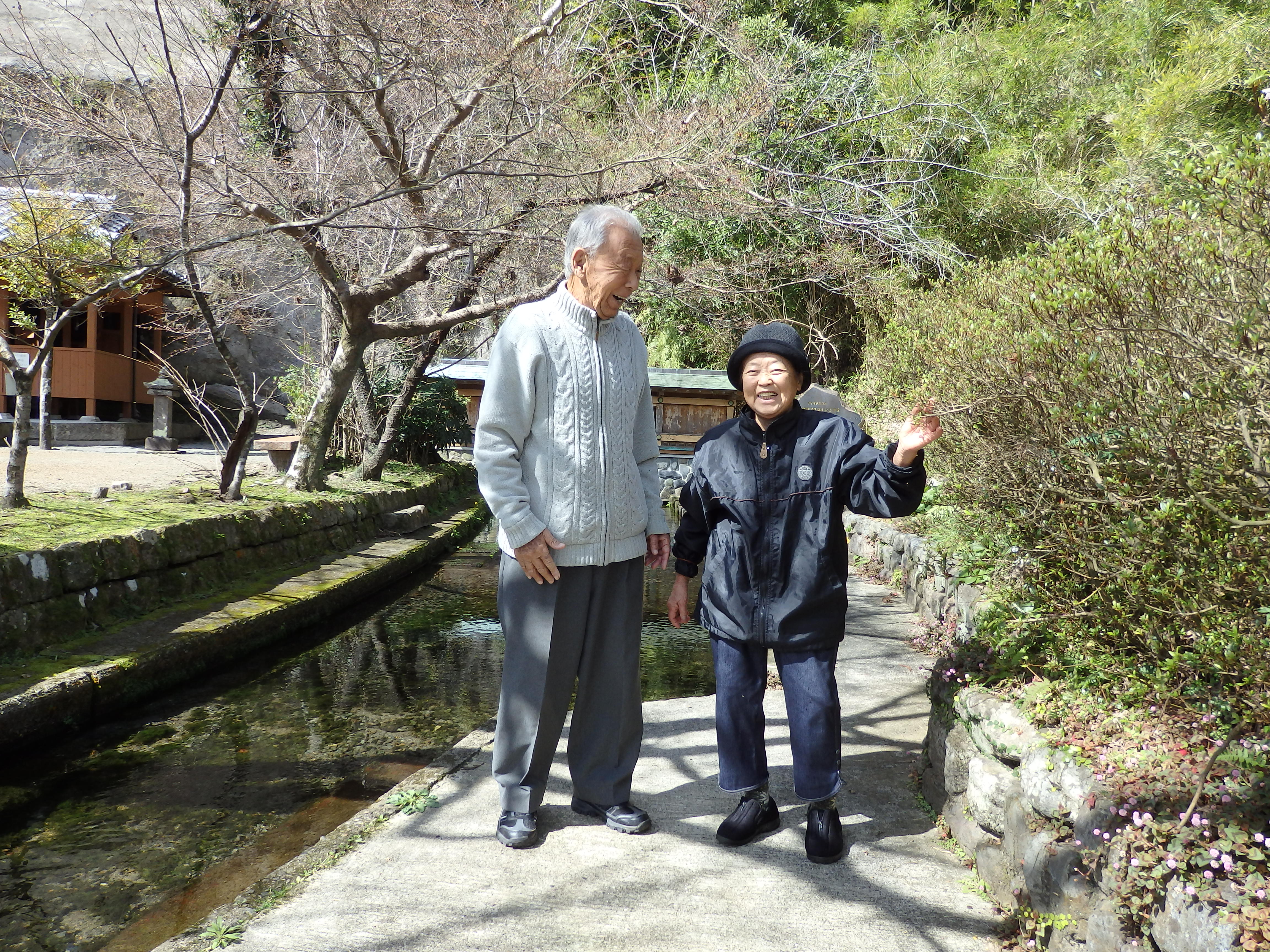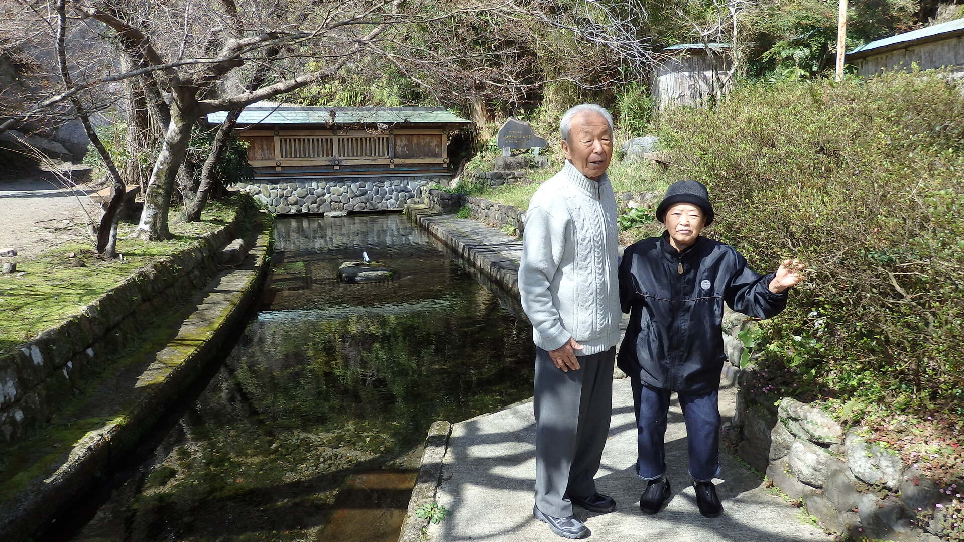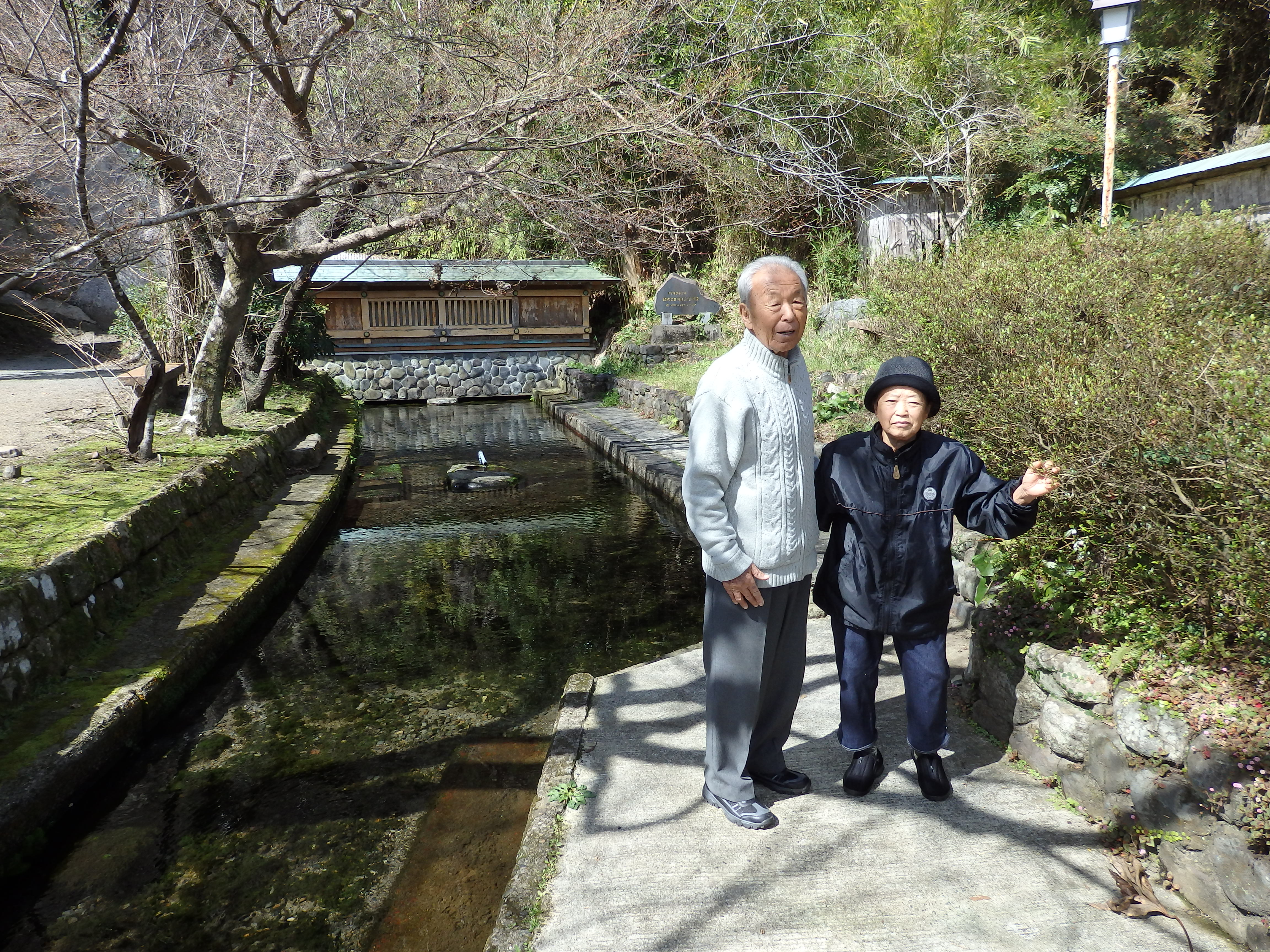 2月26日(月)長雨のあとの久しぶりの晴天、名水百選清水の湧水前を通ると、仲のよさそうな高齢のご夫妻が水を汲んでいました。 お二人は、日置市にお住いの山内稔さん(91歳)栄子さん(87歳)で、ここの水の大ファン。 「1年に10回ほど水汲みに来ていて、今年で22年になる。ここの水は本当においしい。元気にしているのはここの水のおかげかもしれない。」と話してくれました。 山内さん夫妻は協力して、軽バンの荷台いっぱいに積んだポリタンクとペットボトルに清水の湧水を汲み、日置市へと帰っていきました。